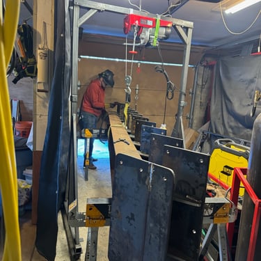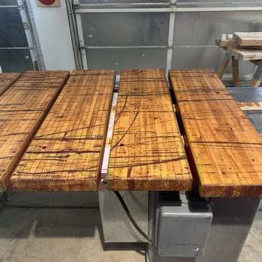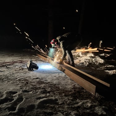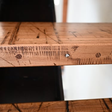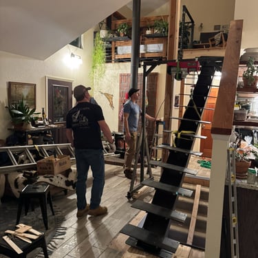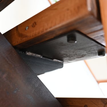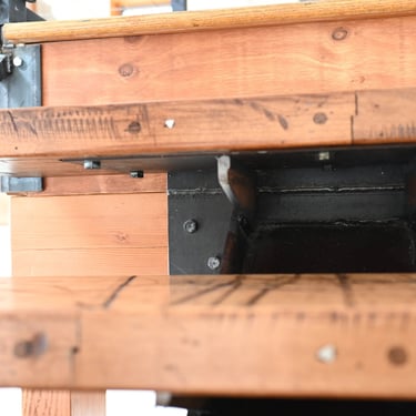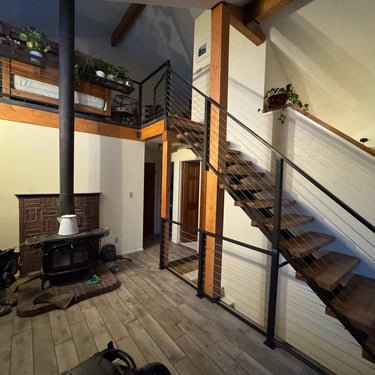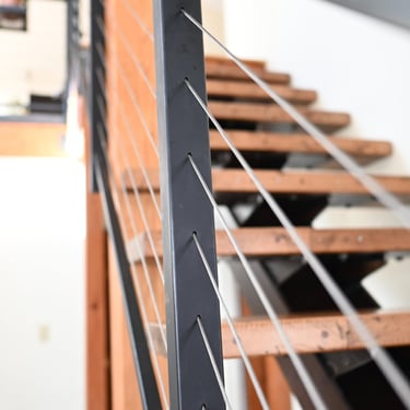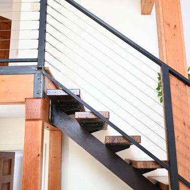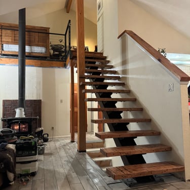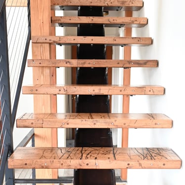 The owners were interested in a simple yet unique staircase design to tie into the steel work in their coming house addition project. We settled on an old, rusty I-beam turned on its side and cut risers out of discarded c-channel found on the property. We preserved the rusty patina with a clear matte acrylic coating and let the 1000lbs stringer speak for itself. The treads are made of reclaimed rock maple boxcar flooring (2.5” thick) that were over 100 years old. Our journeyman carpenter softened the scrapes and scratches, filled the holes with epoxy, but kept the beautiful, distressed appearance accrued over a century of material transport. Keeping the focal point on the staircase, we added a simplistic railing system with ample metal accents on the adjoining loft.