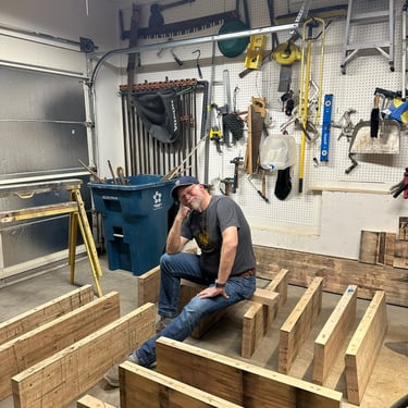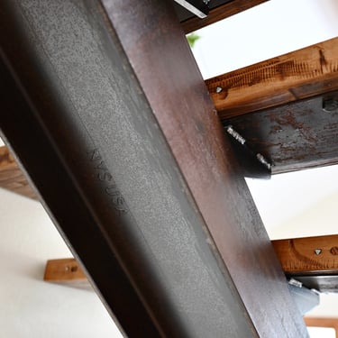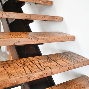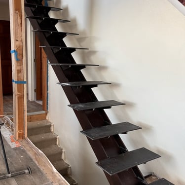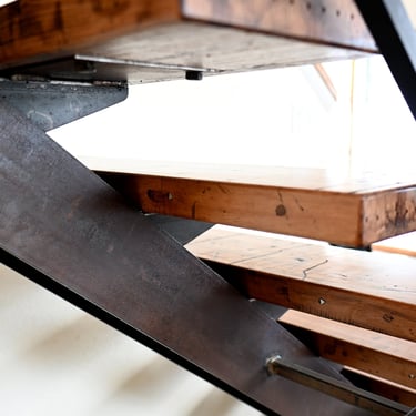 Side project: Funky I-beam staircase with reclaimed boxcar treads.